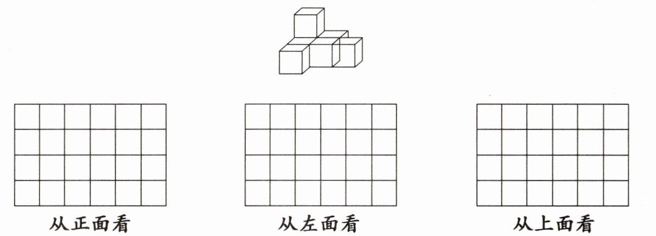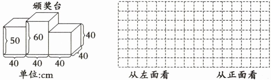 2. 在方格中分别画出从左面和正面观察颁奖台时所看到的图形。(每个小方格的边长代表20cm)