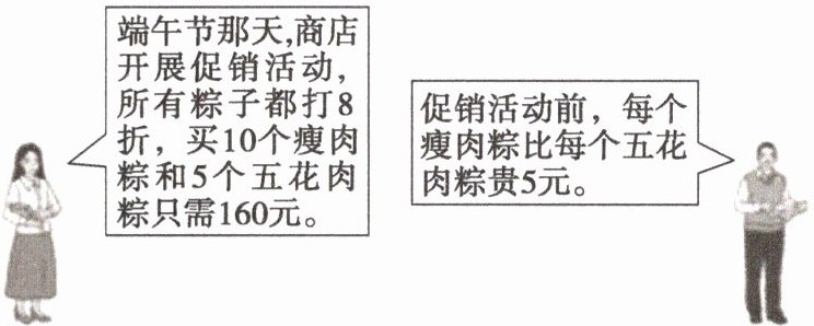 例4 端午节是中国传统节日,人们有吃粽子的习俗.某商店售卖某品牌瘦肉粽和五花肉粽.请依据以下对话,求促销活动前每个瘦肉粽、五花肉粽的售价.