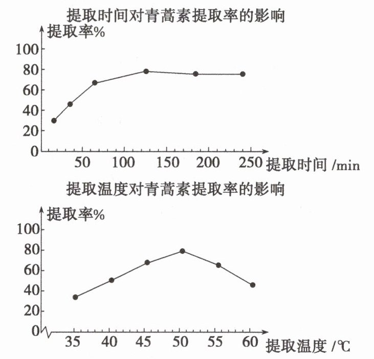 由“提取时间对青蒿素提取率的影响”图可知,提取时间为100min时提取率达到最高,之后随时间延长提取率不再增加;由“提取温度对青蒿素提取率的影响”图可知,提取温度为50℃时提取率达到最高。故最佳的提取时间和提取温度分别为100min,50℃。