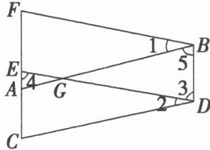 19. 如图,已知∠1= ∠2,∠3= ∠4,∠5= ∠C,试探究DE与BF的位置关系,并说明理由。