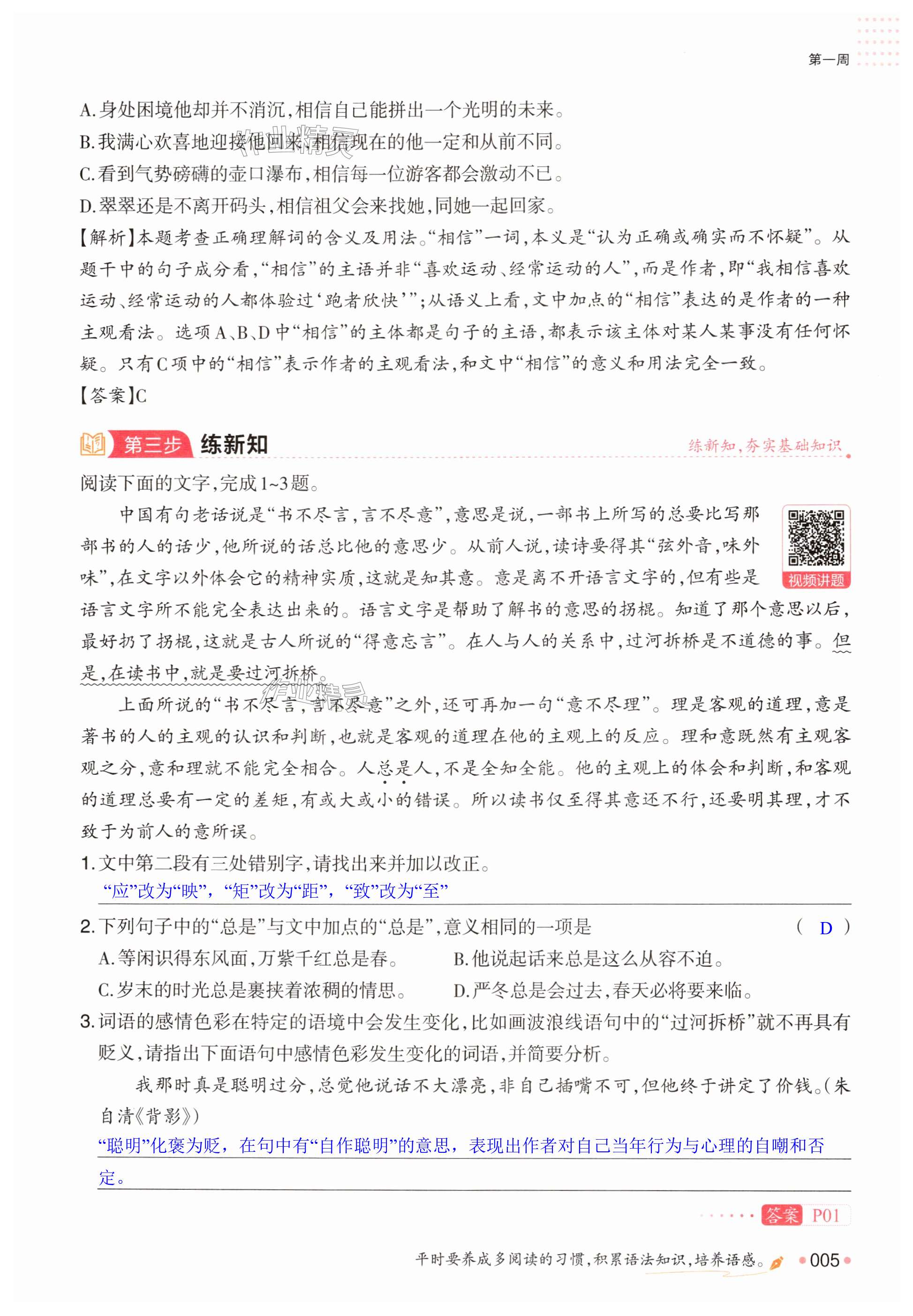 注:目前有些书本章节名称可能整理的还不是很完善,但都是按照顺序排列的,请同学们按照顺序仔细查找。练习册 2025年一本预备新高一语文 答案主要是用来给同学们做完题方便对答案用的,请勿直接抄袭。