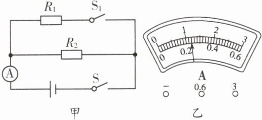5.(新编)在如图甲所示的电路中,电源电压保持不变,电阻 $ R_2 $ 的阻值为 $ 30 \, \Omega $。只闭合开关 $ S $,电流表的示数为 $ 0.4 \, \text{A} $。当开关 $ S $ 和 $ S_1 $ 都闭合时,电流表的示数如图乙所示。求: