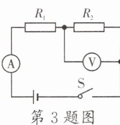 3.(新编)如图所示,闭合开关 $ S $,当电源电压为 $ 4 \, \text{V} $ 时,电压表的示数为 $ 1 \, \text{V} $;当电源电压增加到 $ 12 \, \text{V} $ 时,电流表的示数为 $ 1 \, \text{A} $。则电阻 $ R_1 = $____ $ \Omega $,$ R_2 = $____ $ \Omega $。