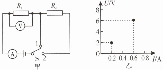 4.(新编)在如图甲所示的电路中,当开关 $ S $ 从“2”转到“1”时,根据电流表和电压表对应的示数,在 $ U - I $ 图像中描绘了相对应的坐标点,如图乙所示。则电源电压是____ $ \text{V} $,电阻 $ R_1 $ 的阻值是____ $ \Omega $,电阻 $ R_2 $ 的阻值是____ $ \Omega $。
