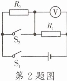 2.(新编)如图所示,$ R_1 = 10 \, \Omega $。当开关 $ S_1 $、$ S_2 $ 均闭合时,电压表的示数为 $ 6 \, \text{V} $;当开关 $ S_1 $ 闭合,$ S_2 $ 断开时,电压表的示数为 $ 4 \, \text{V} $。电源电压 $ U $ 和电阻 $ R_2 $ 的大小分别是 ( )