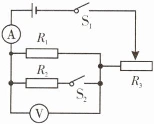 2. (新编)某课外活动小组需要对两个定值电阻$R_1$、$R_2和一只滑动变阻器R_3$的电阻进行测量。将这些元件连成如图所示的电路。闭合开关$S_1$,断开开关$S_2$,将滑动变阻器接入电路的阻值调到最大时,电流表的示数为$0.2 A$,电压表的示数为$2 V$;若将开关$S_1$、$S_2$均闭合,将滑动变阻器接入电路的阻值调到零时,电压表的示数为$6 V$,电流表的示数为$0.9 A$。
