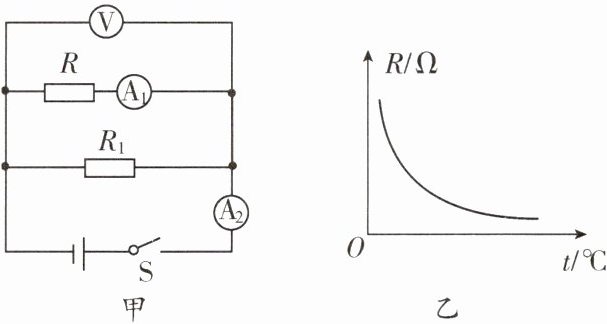 7.(黄冈中考)课后服务时间,老师和物理兴趣小组的同学用一个热敏电阻与其他电学元件组成了如图甲所示的电路。电源电压恒定不变,$R_{1}$是定值电阻,R是热敏电阻,其阻值R与温度t的关系如图乙所示。开关S闭合,热敏电阻的温度升高时,下列说法正确的是( )