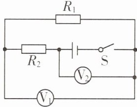 变式训练1 如图所示的电路中,$R _ { 1 } = 10 \Omega $,$R _ { 2 } = 20 \Omega $,闭合开关S,电压表$V _ { 1 } 与V _ { 2 } $的示数之比是( )