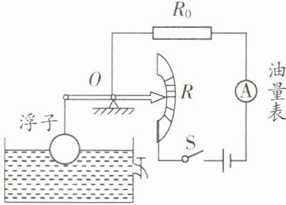 4.(泰州中考)如图是小明自制的一种测定油箱内油面高度的装置。油量表是由量程为$0\sim 0.6A$的电流表改装而成的,滑动变阻器$R的最大阻值为20Ω$,从油量表指针所指的刻度,就可以知道油箱内油面的高度。已知电源电压为$12V$,当油箱内油面高度最高时,$R$的金属滑片在最下端,油量表指针满偏;当油箱内没有油时,$R$全部接入电路,油量表的示数最小。则$R_{0}$的阻值是____$Ω$,油量表的最小示数是____$A$。当油箱内油面的高度降为最高油面一半时,滑片正好在$R$的中点,此时油量表的示数是____$A$,据此推理油量表的刻度____(选填“均匀”或“不均匀”)。
