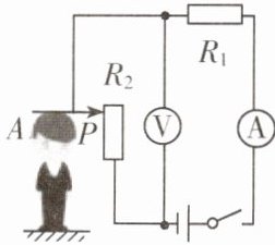 5.(广元中考)如图所示的是课外活动时,同学们设计的电子身高测量仪的电路简图,绝缘板$A与滑动变阻器R_{2}的滑片P$固定在一起,且同步上下移动。已知电源电压恒为$20V$,定值电阻$R_{1}= 30Ω$,滑动变阻器的规格为“$100Ω$ $1A$”,电压表的量程为$0\sim 15V$,电流表的量程为$0\sim 3A$。下表为$R_{2}$接入电路的阻值与被测者身高的对应关系。某同学测得自己的身高为$165cm$,测量时通过电流表的电流为____$A$;为保证电路安全工作,此测量仪测量的身高最多不能超过____$cm$。