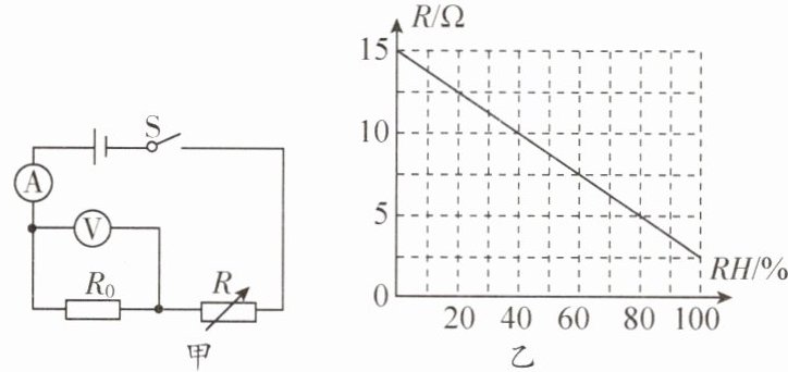 3.(娄底中考)如图甲所示为湿度表的简化工作原理图,电源电压恒为$6V$,定值电阻$R_{0}= 5Ω$,$R$为湿敏电阻,其阻值$R随环境湿度RH$的变化如图乙所示,电压表量程为“$0\sim 3V$”,电流表量程为“$0\sim 0.6A$”。闭合开关$S$,在保证两表安全的情况下: