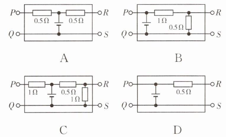1.(新编)有一电学黑箱,内有电池及定值电阻若干只,以一定方式连接,外有P、Q、R、S四个接头。已知当用电压表测量P、Q间电压时,示数为1.5V;测量R、S间电压时,示数为0.5V。图中画出了黑箱内部的四种电路,其中能满足本题所给条件的是图( )