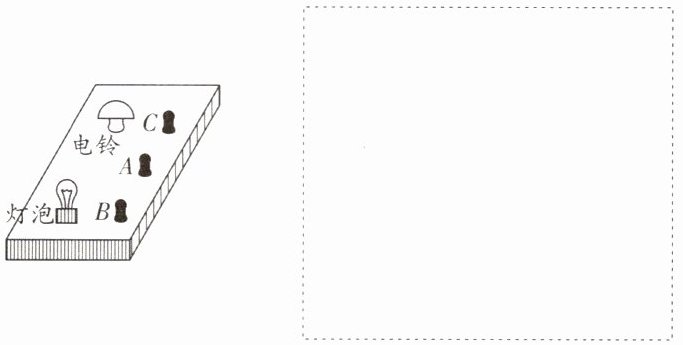 (在虚线框内画出:A接线柱连接电源正极和灯泡一端,电源负极连接电铃一端,电铃另一端连接C接线柱,灯泡另一端连接B接线柱。)