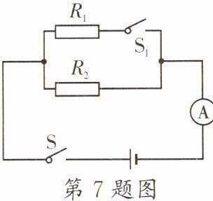 7. (新编)如图所示,电源电压为$12V$。只闭合开关$S$时,电流表的示数为$0.3A$;若再闭合开关$S_{1}$,电流表的示数变化了$0.6A$。开关$S$、$S_{1}$都闭合时,下列说法中正确的是( )