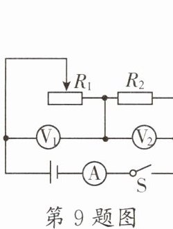 9. (海南中考)如图所示的电路中,电源电压不变,闭合开关$S$,向右移动滑动变阻器$R_{1}$的滑片,下列数据变小的是( )