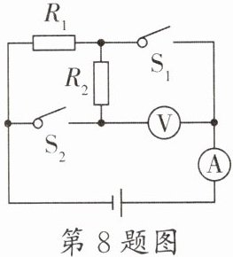 8. (新编)在如图所示的电路中,电源电压为$3V$且保持不变,$R_{1}的阻值为10\Omega$,$R_{2}的阻值为20\Omega$。下列选项中正确的是( )