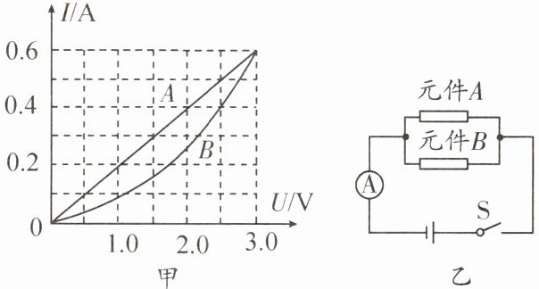 13. (新编)有两个电路元件$A和B$,通过元件的电流与其两端电压的关系如图甲所示。把它们并联在电路中,如图乙所示,闭合开关S,这时电流表的示数为0.9 A,则电源电压和元件$B$的电功率分别是( )