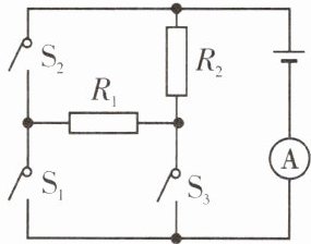 变式训练3 在如图所示的电路中,电源电压保持6V不变。当开关$$ S_{1} $$断开,$$ S_{2} $$、$$ S_{3} $$闭合时,电流表的示数为1A;当开关$$ S_{1} $$闭合,$$ S_{2} $$、$$ S_{3} $$断开时,电流表的示数为0.25A,$$ R_{2} $$的电功率为 W,$$ R_{1} $$的阻值为 Ω。