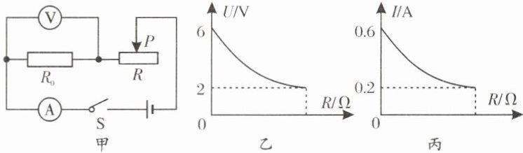 15. (新编)(多选)如图甲所示,电源电压保持不变,$$ R_{0} $$为定值电阻,R为滑动变阻器。闭合开关S,滑动变阻器R的滑片从一端移动到另一端的过程中,电压表和电流表的示数与R的关系分别如图乙、丙所示。下列说法中正确的是 ( )