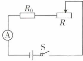16. (六盘水中考)如图所示的电路,电源电压不变,定值电阻$$ R_{0} $$与滑动变阻器R串联。调节滑动变阻器R的滑片至某一位置时,电流表的示数为0.1A,R的功率为0.6W;当滑片移动到另一位置时,电流表的示数变化了0.2A,R的功率为0.9W。则电源电压$$ U = $$ V。