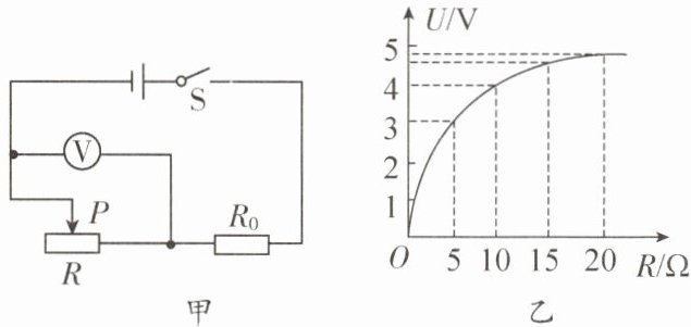 12. (苏州中考)如图甲所示的电路中,电源电压不变,$$ R_{0} $$为定值电阻,R为滑动变阻器。闭合开关,滑片P移动的过程中,电压表的示数随滑动变阻器接入电路中的阻值变化的关系如图乙所示。下列说法正确的是 ( )