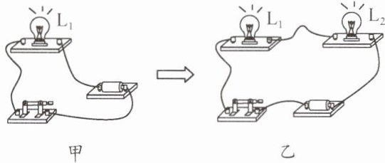 11. (新编)小明按图甲连接电路,闭合开关,灯泡$$ L_{1} $的功率为$ P_{1} $$。他将一个阻值大于$$ L_{1} $的灯泡$ L_{2} $$串联接入电路(如图乙),闭合开关后,$$ L_{1} $$、$$ L_{2} $的功率分别为$ P_{1}' $$、$$ P_{2}' $$(不计温度对灯泡电阻的影响,电源电压恒定),下列关系式正确的是 ( )