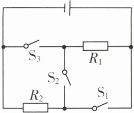 12.(新疆中考)如图所示的电路中,电源电压恒为3V,$R_{1}$、$R_{2}$均为定值电阻。若断开开关$S_{1}$、$S_{3}$,闭合开关$S_{2}$,电路的总功率为0.5W;若断开开关$S_{2}$,闭合开关$S_{1}$、$S_{3}$,则电路的总功率不可能为( )