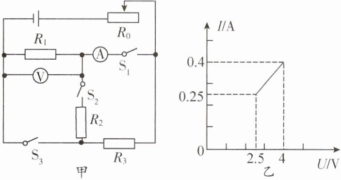 11.(德州中考)如图甲所示,电源电压U保持不变,当只闭合开关$S_{1}$,滑动变阻器$R_{0}$的滑片从最右端滑向中点的过程中得到的电压表与电流表示数的变化图像如图乙所示。闭合开关$S_{1}$、$S_{3}$,断开开关$S_{2}$,滑动变阻器$R_{0}$的滑片在最左端时,电路的总功率为15W。已知$R_{2}= 2R_{1}$,求: