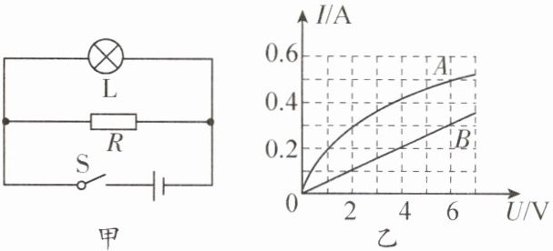 10.(新编)灯泡L与定值电阻R组成的电路如图甲所示,L和R的I-U图线分别为图乙中的A、B。当S闭合时,L正常发光,此时电路的总功率为4.8W,则R的阻值为____Ω,灯泡L的额定电压为____V。若将它们串联后接在8V电源两端,灯泡L的实际功率为____W。
