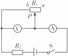 【例2】如图所示的电路中,电源电压U= 6V不变$,R_1$为滑动变阻器$,R_2$为定值电阻。开关S闭合后,当滑片P在滑动变阻器的a、b两端之间滑动的过程中,电流表的示数在0.4A~1.2A之间变化,则下列结论正确的是( )
