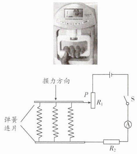 4.(雅安中考)如图所示为某种握力计和它的工作原理示意图。电源电压不变,握力计显示表是由电流表改装而成的,定值电阻$R_2= 5Ω。$不施加力时弹簧一端的滑片P在电阻$R_1$的最上端(弹簧及连片的电阻不计)。使用握力计时电路中电流变化的范围为0.1A~0.6A。下列说法中正确的是( )