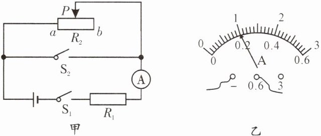 (2)当开关$S_1$闭合$,S_2$断开时,将滑片P移到中点,电流表的示数如图乙所示,求滑动变阻器$R_2$的最大阻值。