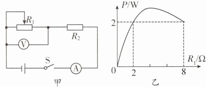 9.(鄂尔多斯中考)在如图甲所示的电路中,电源电压恒定$,R_1$为滑动变阻器$,R_2$为定值电阻。开关闭合后,将滑动变阻器的滑片从一端移至另一端的过程中,滑动变阻器的电功率P随其接入电路中的阻值$R_1$的变化关系如图乙所示。下列对电路的表述中,正确的是( )
