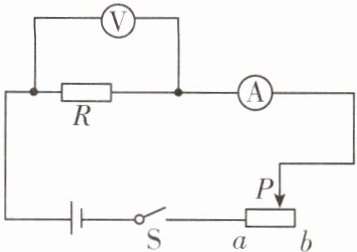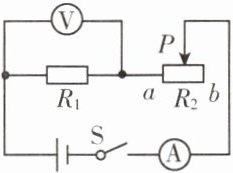 8.(新编)(多选)如图所示的电路中,电源电压不变$,R_1$为定值电阻$,R_2$为滑动变阻器(a、b为其两端点)。闭合开关S,当滑片P在b端时,电流表示数为$0.3A,R_2$消耗的电功率为0.9W;当滑片P移动至某一位置时,电流表示数为$0.5A,R_2$消耗的电功率为0.5W。则当滑片P从a端移到b端的过程中( )