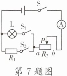 7.(广安中考)如图,电源电压恒定不变,灯泡L上标有“6V 3.6W”的字样(灯泡电阻受温度的影响忽略不计)。$R_1= 30Ω,$滑动变阻器$R_2$的最大阻值为50Ω,当开关S、$S_1$闭合$,S_2$断开且滑片P在b端时,电流表的示数为0.2A。求: