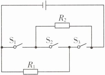 6. (德阳中考)如图所示的电路中,电源电压$ U = 10 V $,$ R _ { 1 } = 5 \Omega $,$ R _ { 2 } = 20 \Omega $。只闭合开关$ S _ { 1 } $时,电路中的工作电流是____$ A $;当只闭合开关$ S _ { 2 } 时电路消耗的功率为 P $,只闭合开关$ S _ { 1 } 和 S _ { 3 } 时电路消耗的功率为 P ^ { \prime } $,则两次功率之比$ P : P ^ { \prime } $等于____。