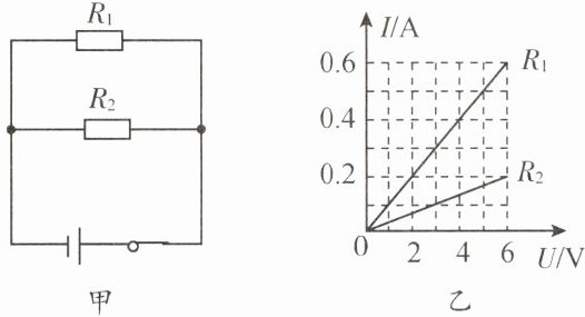 3. (天门中考)(多选)如图甲所示的电路中,电阻为$ R _ { 1 } $、$ R _ { 2 } $,其电流与电压的关系如图乙所示。闭合开关,$ R _ { 1 } 两端的电压为 U _ { 1 } $,电流为$ I _ { 1 } $,电功率为$ P _ { 1 } $;$ R _ { 2 } 两端的电压为 U _ { 2 } $,电流为$ I _ { 2 } $,电功率为$ P _ { 2 } $;电路的总电阻为$ R $,总电压为$ U $,总电流为$ I $,总功率为$ P $。则 ( )