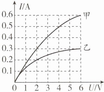 4. (新编)(多选)额定电压均为$ 6 V $的甲、乙两灯的$ I - U $图线如图所示。下列说法中正确的是 ( )