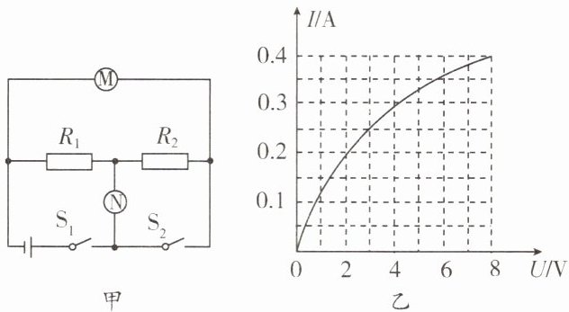8. (广元中考)如图甲所示的电路,电源电压不变,$ R _ { 1 } $是定值电阻,通过$ R _ { 2 } 的电流与 R _ { 2 } $两端的电压关系如图乙所示。当$ M $、$ N $都是电流表,且开关$ S _ { 1 } $闭合、$ S _ { 2 } $断开时,$ M 的示数为 0.4 A $,电路的总电阻为$ R ^ { \prime } $;当$ M $、$ N $都是电压表,且开关$ S _ { 1 } $、$ S _ { 2 } $都闭合时,$ N 的示数为 2 V $,电路的总电阻为$ R ^ { \prime \prime } $。下列说法正确的是 ( )