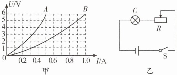 (3)如图乙所示,将$ C 灯和一个滑动变阻器 R $接入到另一个电源电压恒定的电路中,当闭合开关$ S $,滑动变阻器$ R 的滑片位于中点时 C $灯正常发光,此时$ C 灯的电功率为 P $;当滑片位于最右端时,$ C 灯的实际电功率为 P ^ { \prime } $,已知$ P : P ^ { \prime } = 16 : 9 $,求此电路的电源电压。(设$ C $灯的电阻始终不变)
