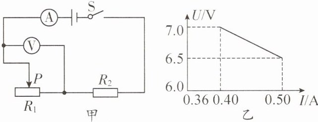 7. (遵义中考)(多选)如图甲所示的电路,电源电压保持不变,电流表的量程为0~0.6A,电压表的量程为0~15V,滑动变阻器$R_1$的阻值变化范围为$0~20Ω,R_2$为定值电阻。闭合开关S,滑片P在某两点间移动时电流表的示数与电压表的示数的变化关系图像如图乙所示。在保证电路安全的情况下,下列说法正确的是( )