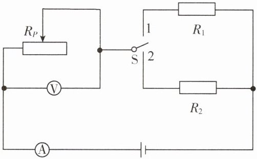 12. (成都中考)(多选)如图所示的电路,电源电压U恒定不变$,R_1= 30Ω,R_2= 20Ω,$滑动变阻器上标有“100Ω 2A”的字样,电压表的量程为0~15V,电流表的量程为0~3A。当滑动变阻器的滑片移到最左端,开关S接通触点1时,电流表的示数为0.8A;当开关S接通触点2,为保障电路安全,滑动变阻器接入电路的阻值为R';当改变滑片的位置、开关S接不同触点,在保障电路安全的情况下,电路工作的最大电流和最小电流分别为I大和I小。下列计算正确的是( )