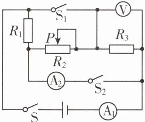 11. (成都中考)(多选)如图所示的电路,电源电压U恒定不变,电流表$A_1$的量程为0~3A,电流表$A_2$的量程为0~0.6A,电压表V的量程为0~3V或0~15V。闭合开关S,断开开关$S_1、$$S_2,$滑片P移到最左端$,A_1$表的示数为$0.35A,R_1$和$R_3$消耗的电功率之比$P_1:P_3= 3:1;$滑片P向右移到某一位置的过程中$,A_1$表的示数变化了0.3A,V表的示数变化了3V。三个开关都闭合时,在确保电路安全的前提下$,R_2$允许接入的最小阻值为$R_2$小,电路消耗的最大电功率为P大。下列结论正确的是( )