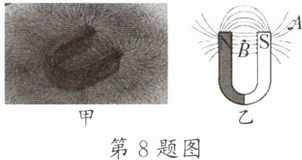 8.(新编)在蹄形磁铁的上面放一块玻璃板,在玻璃板上均匀地撒上一层铁屑,轻轻地敲击玻璃板,可以看到小铁屑的排列如图甲所示,磁场的分布情况便被形象地显示出来了;仿照铁屑在磁场中排列的情况,画出一些带箭头的曲线形象地描述磁场,物理学中把这样的曲线叫作____,磁体外部的磁感线都是从____极出发的;如图乙所示,在A点的磁场强度____(选填“大于”或“小于”)B点的磁场强度。
