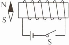 【例 3】如图所示,当开关闭合时,请标出通电螺线管右端的极性,并用箭头标出小磁针 N 极的偏转方向。