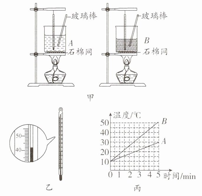 22. (广安中考)为了探究“不同物质的吸热性能”,在两个相同的容器中分别装入质量、初温都相同的两种液体$A$、$B$,并且用相同的装置加热,如图甲所示。