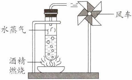 5. (新编)如图是模拟热机工作的示意图,它展示的能量转化的基本过程是酒精的____能通过燃烧转化为水和水蒸气的____能,接着通过做功转化为风车的____能。