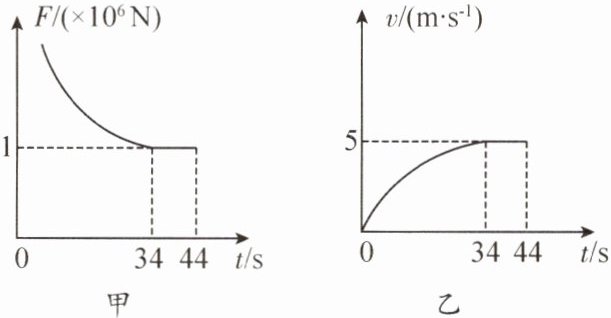 4. 由图甲、乙知,34s后驱逐舰匀速运动,此时$F = 1×10^6N$,$v = 5m/s$,则发动机功率:$P = Fv = 1×10^6N×5m/s = 5×10^6W$