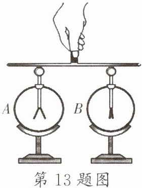 13. (常德中考)如图所示,有两个相同的验电器,其中A带正电、B不带电。用带有绝缘柄的金属棒把A和B连接起来。下列说法错误的是 ( )