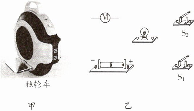 15.(新编)如图甲所示的电动独轮车,当电源开关$S_{1}$闭合时指示灯亮起,独轮车处于待机状态,再当人站在独轮车上时开关$S_{2}$自动闭合,电动独轮车中的电动机启动,独轮车开始运动。独轮车中的简化电路如图乙所示,请按独轮车的要求,在图乙中完成电路的连接。